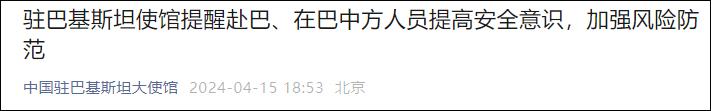 據微信公眾號“中國駐巴基斯坦大使館”4月15日消息,目前巴基斯坦總體安全形勢嚴峻複雜,俾路支省、開普省安全事件頻繁發生,近日載有中方人員的車輛遭遇恐襲並導致我公民遇難。