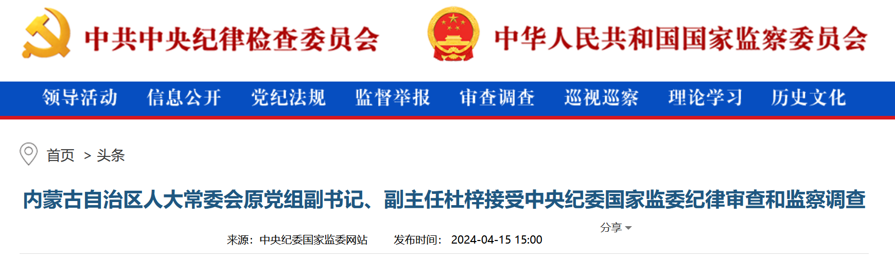 中央紀委國家監委網站15日通報:內蒙古自治區人大常委會原黨組副書記、副主任杜梓涉嫌嚴重違紀違法,目前正接受中央紀委國家監委紀律審查和監察調查。