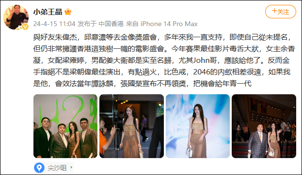 他表示,最佳影片《毒舌大壯》、女主餘香凝、女配梁雍婷、男配姜大衞都是實至名歸,而《金手指》絕不是梁朝偉的最佳演出,“如果我是他,會效法當年譚詠麟、張國榮,宣佈不再領獎,把機會給年青一代”。