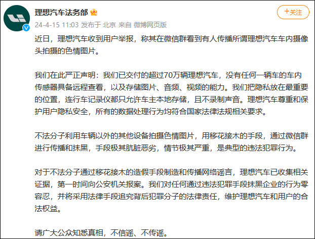 @理想汽車法務部 4月15日發佈聲明回應“網傳車內攝像頭拍攝色情圖片”,稱對於不法分子通過移花接木的造假手段製造和傳播網絡謠言,理想汽車已收集相關證據,第一時間向公安機關報案。