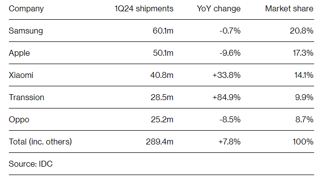 在Nabila Popal看來,智能手機市場正在擺脱過去兩年的動盪,但也出現了新變化。數據顯示,2024年第一季度,傳音的出貨量猛增85%,達到2850萬部;小米迎來反彈,出貨量同比增長33.8%,達到4080萬部,進一步縮小了與蘋果的差距。