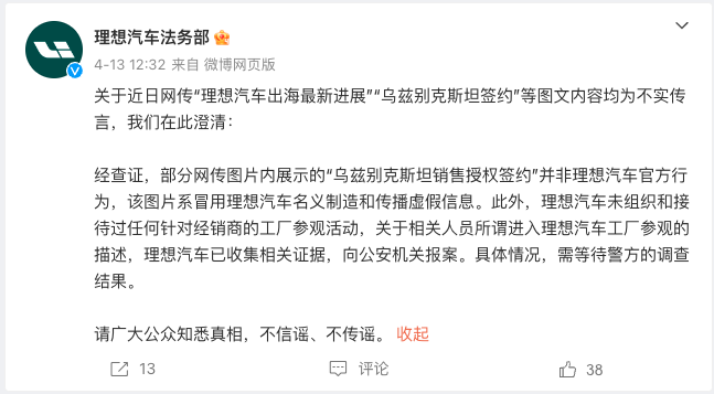 (文/周盛明 編輯/張廣凱)日前,有網傳信息顯示,有相關人員冒用理想汽車名義,傳播“理想汽車與烏茲別克斯坦銷售授權簽約”的虛假新聞。對此,理想汽車法務部在官方微博發聲闢謠。