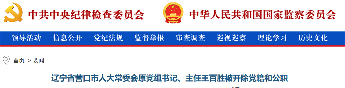 據中央紀委國家監委網站4月15日消息,據遼寧省紀委監委消息:日前,經遼寧省委批准,遼寧省紀委監委對營口市人大常委會原黨組書記、主任王百勝嚴重違紀違法問題進行了立案審查調查。