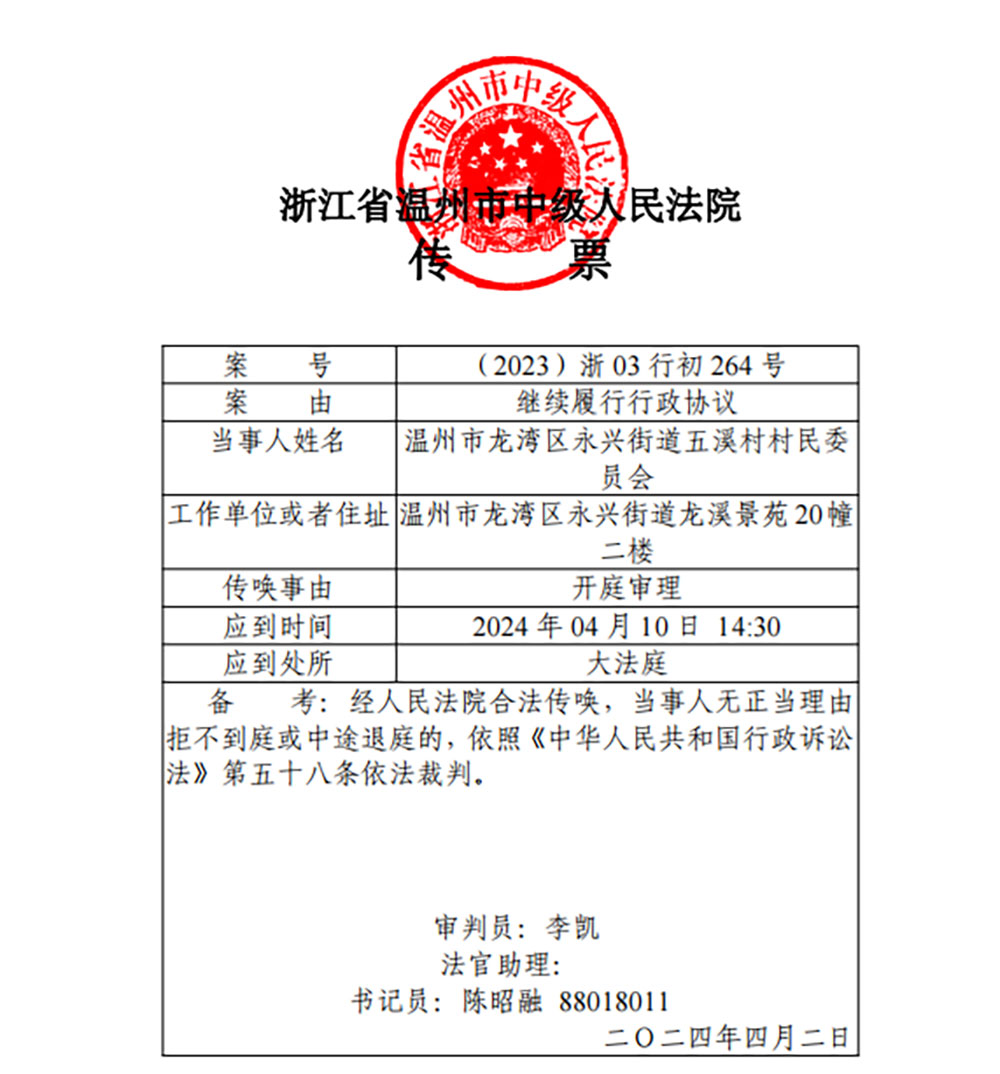 王衞洲説,對於這個案子,很多村民都想參與旁聽,律師也積極和温州中院溝通,儘可能用可容納人數最多的法庭來審理。4月2日,村民收到温州中院傳票,開庭時間確定在4月10日,同時確定的法庭也是能容納上百人的大法庭。