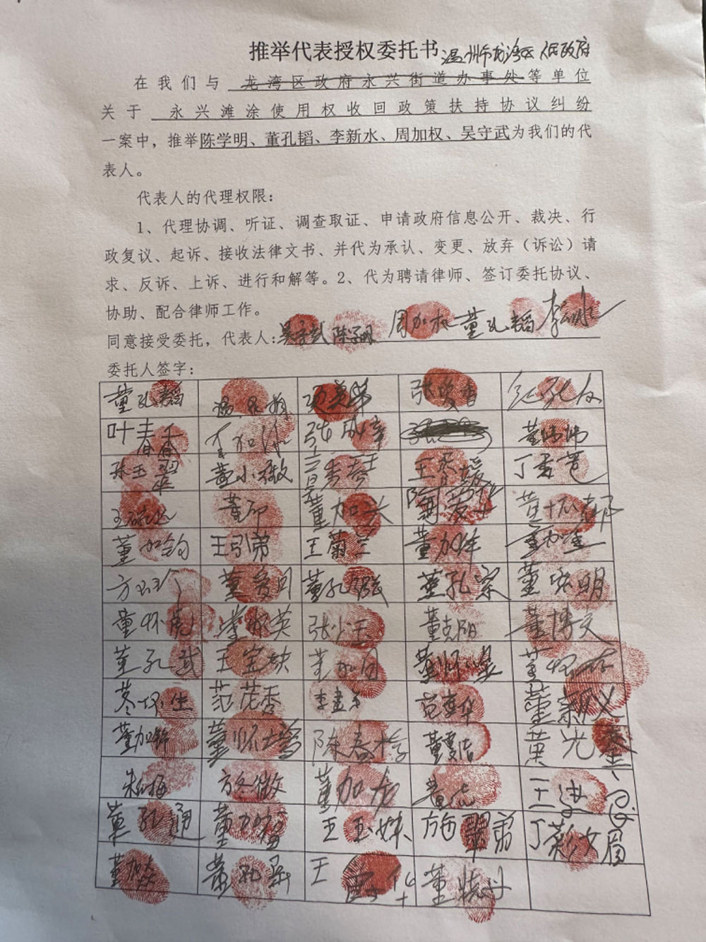 沒想到,一個月後,王衞洲接到五溪村村民反饋,經過全村35個生產隊1641名的村民簽名、推舉,推選出了陳學明、董孔韜、李新水、周加權、吳守武為案件訴訟代表人。經過3天公示後,沒有村民提出異議。訴訟代表人的權限除了聘請律師外,還包括協調、聽證、調查取證、申請信息公開、行政複議、起訴、上訴等。
