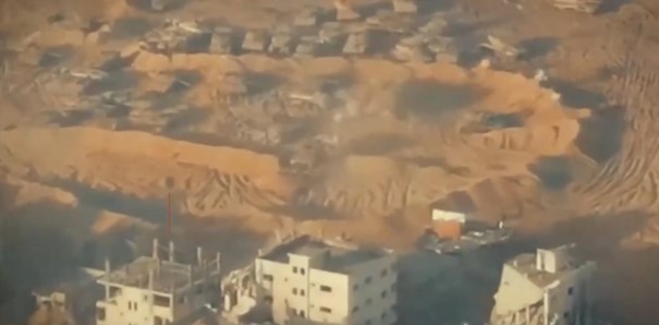 哈馬斯發佈的以軍“土圍子”遭遇迫擊炮攻擊的無人機畫面,可見以軍裝甲車輛的密集停放。圖自網絡