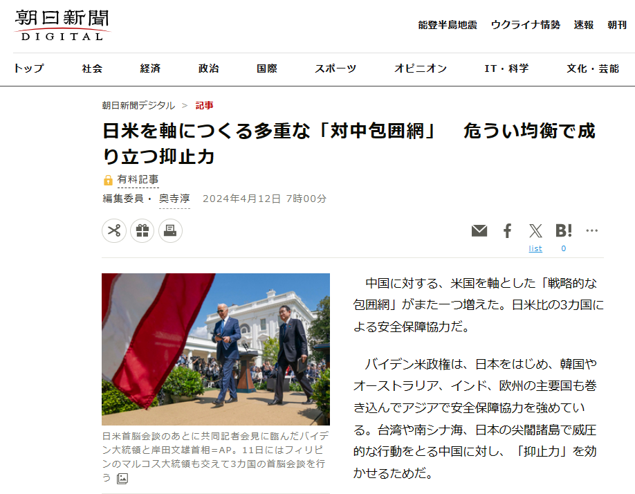 對於岸田自4月8日開始訪美一事,4月12日,日本五大報之一的《朝日新聞》發表了該報原駐北京記者、現任編輯委員奧寺淳的評論,題目為“以日美為軸心的多重‘對中包圍網’,在危險均衡上形成的抑制力”,將岸田內閣準備在軍事、外交、經濟等各個方面與中國對立的背景作了詳盡分析。