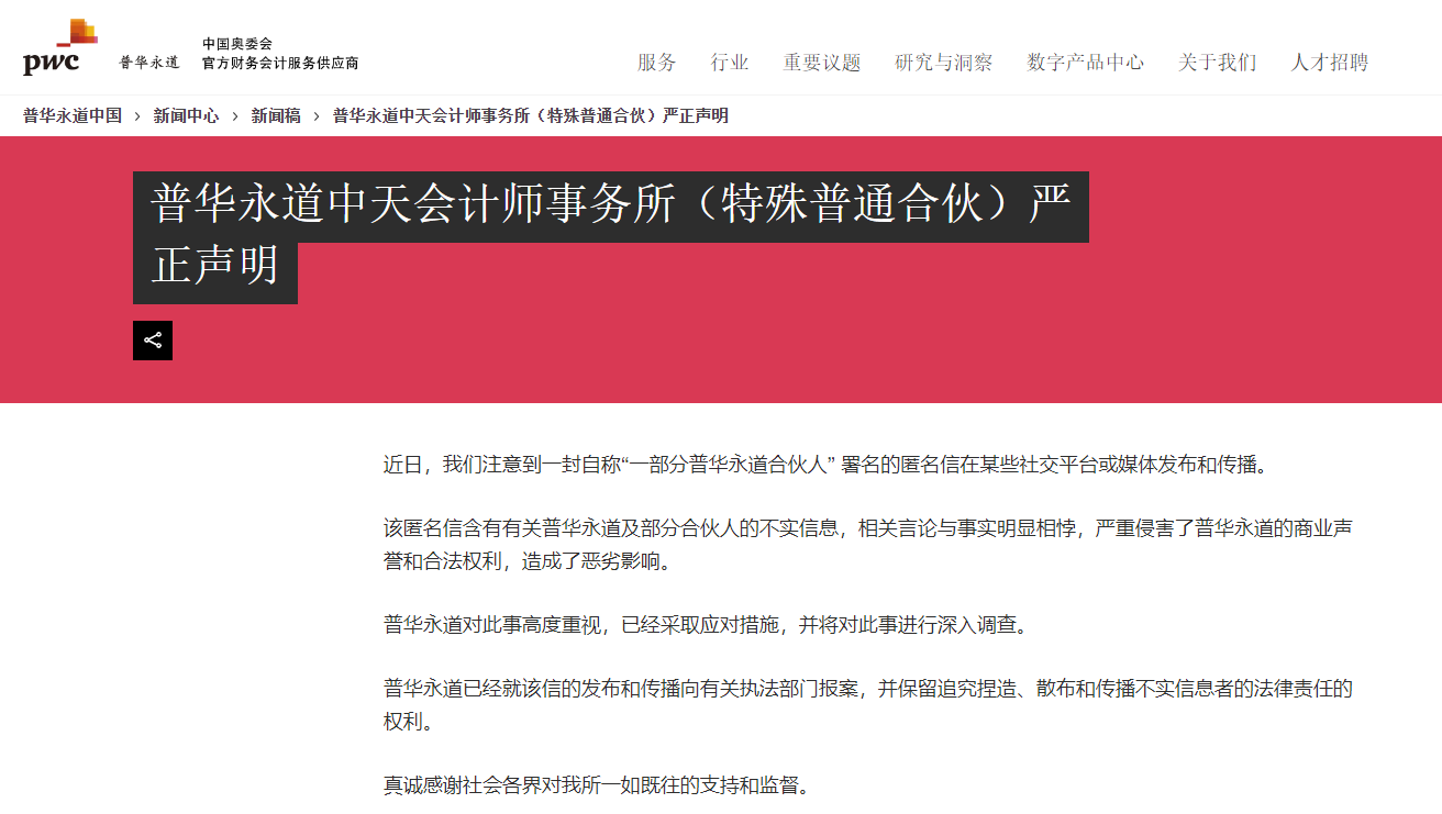 普華永道中國官網4月15日發佈聲明稱,近日,普華永道注意到一封自稱“一部分普華永道合夥人” 署名的匿名信在某些社交平台或媒體發佈和傳播。該匿名信含有有關普華永道及部分合夥人的不實信息,相關言論與事實明顯相悖,嚴重侵害了普華永道的商業聲譽和合法權利,造成了惡劣影響。