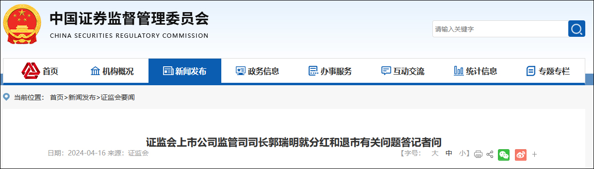 據證監會網站4月16日消息,證監會上市公司監管司司長郭瑞明就分紅和退市有關問題答記者問。