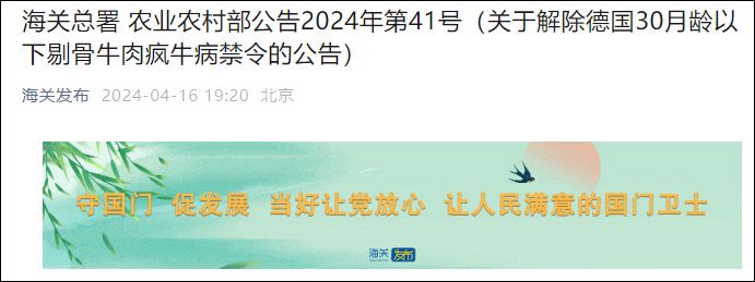 據微信公眾號“海關發佈”消息,4月16日,海關總署、農業農村部發布公告,根據風險評估結果,自本公告發布之日起,解除原農業部、原國家出入境檢驗檢疫局聯合公告2001年第143號對德國30月齡以下剔骨牛肉的瘋牛病禁令。