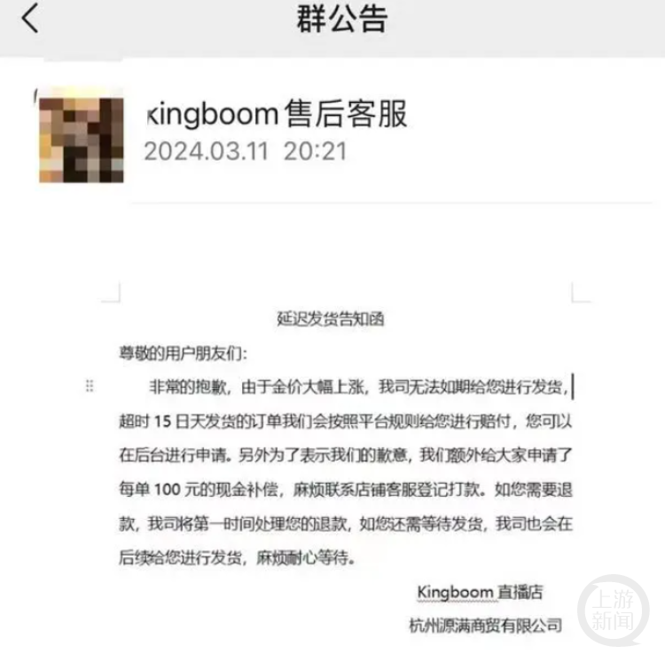 記者搜索發現,近期由於金價上漲,出現過多起商家拒絕發貨的糾紛。據中新經緯3月20日報道,多名消費者在淘寶“香菇來了”直播間購買的kingboom品牌金條逾期多天未發貨。其中一位消費者花費110餘萬元購買了2300克金條,僅發貨400克。對此,該店鋪客服曾表示:“因為某些不可抗力原因,kb的訂單無法如期給您發出。”後來店鋪還發布“延遲發貨告知函”,稱“由於金價大幅上漲,我司無法如期給您進行發貨,超時15日發貨的訂單會按照平台規則給您進行賠付。”但消費者表示,隨着金價上漲,每克黃金比購買時貴了22元,但按照店鋪的説法,每人的賠付金額僅100元,“我們怎麼可能同意?”
