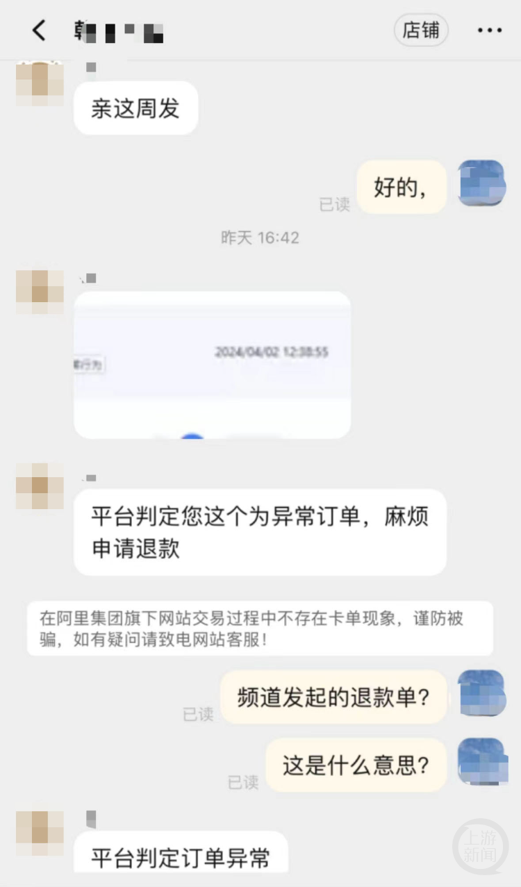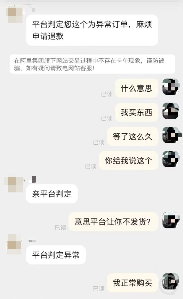 16日上午,廣東網友葉女士(化名)告訴記者,3月29日,自己在淘寶店鋪“乾X金銀”購買了100克黃金,共付款51700元。商品截圖顯示,這些黃金屬於預售,將在4月12日13點44分前發貨。當時店鋪客服表示,會在規定時間內發貨。儘管後來葉女士多次催促,但在發貨時間已過的情況下,該店鋪一直沒有發貨。葉女士再次聯繫上商家,店鋪客服卻表示:“親,平台判定您這個為異常訂單,麻煩申請退款。”對此葉女士表示不解:“我就是正常下單,怎麼就成了異常訂單?”16日,她再次聯繫上對方,並表示自己已經向市監局和淘寶客服投訴,但該店鋪客服仍然表示無法發貨,“平台判定是異常單。”客服發來的截圖顯示:“異常訂單(付款後批量、頻繁發起退款的異常行為),不計入消費體驗指標,投訴免責(該筆訂單支持不發貨,若賣家已發起延遲發貨投訴,且在處理中,您可拒絕投訴,投訴將不成立)。”時間為4月1日晚上9點27分。