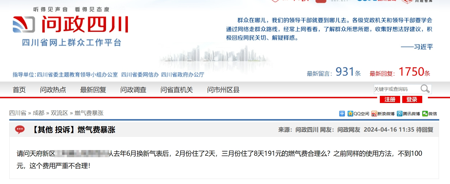 在“問政四川”平台還有多則反映燃氣用氣量升高的留言目前未獲回覆。