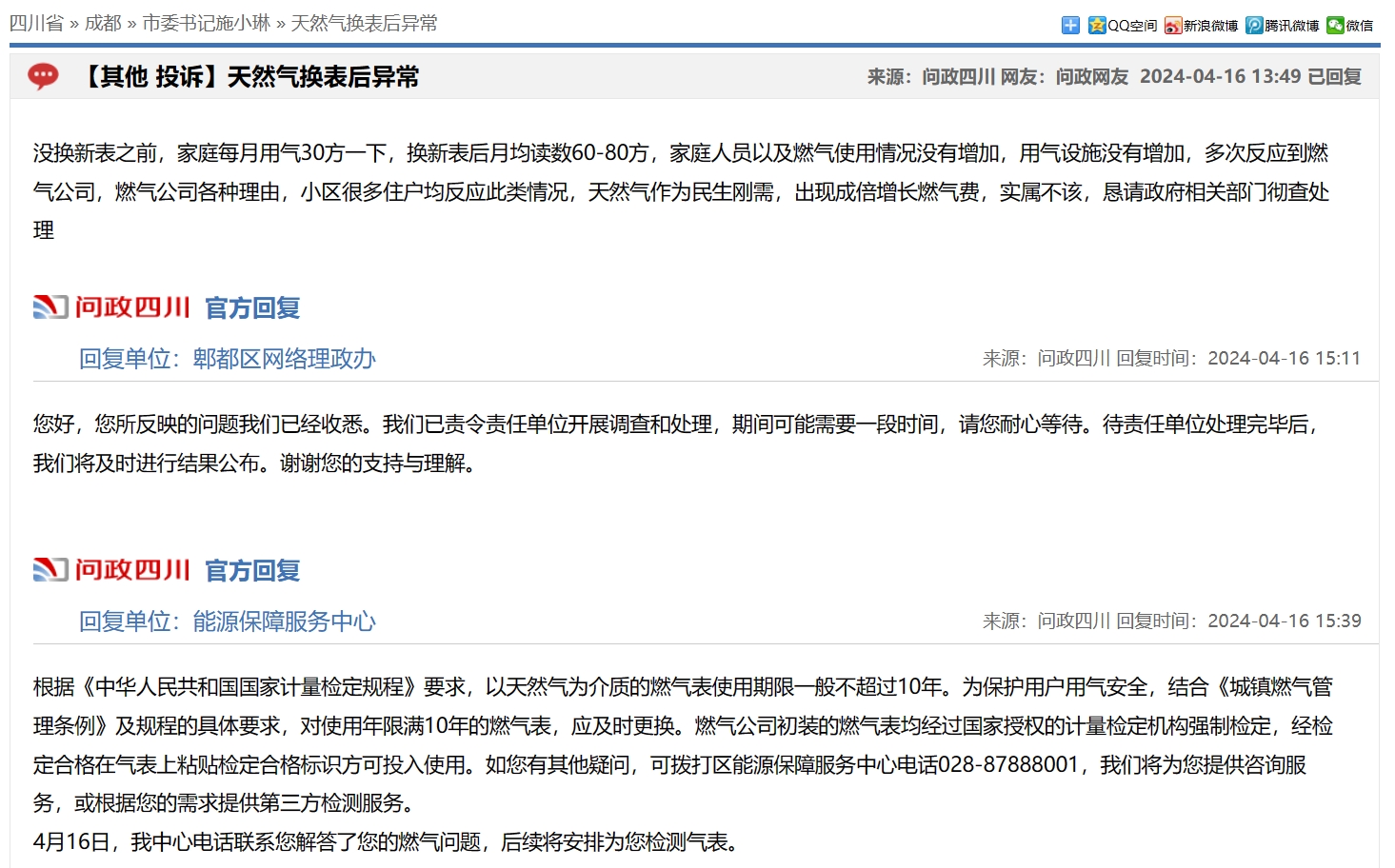 能源保障服務中心則解釋稱:“根據《中華人民共和國國家計量檢定規程》要求,以天然氣為介質的燃氣表使用期限一般不超過10年。為保護用户用氣安全,結合《城鎮燃氣管理條例》及規程的具體要求,對使用年限滿10年的燃氣表,應及時更換。燃氣公司初裝的燃氣表均經過國家授權的計量檢定機構強制檢定,經檢定合格在氣表上粘貼檢定合格標識方可投入使用。如您有其他疑問,可撥打區能源保障服務中心電話028-87888001,我們將為您提供諮詢服務,或根據您的需求提供第三方檢測服務。4月16日,我中心電話聯繫您解答了您的燃氣問題,後續將安排為您檢測氣表。”
