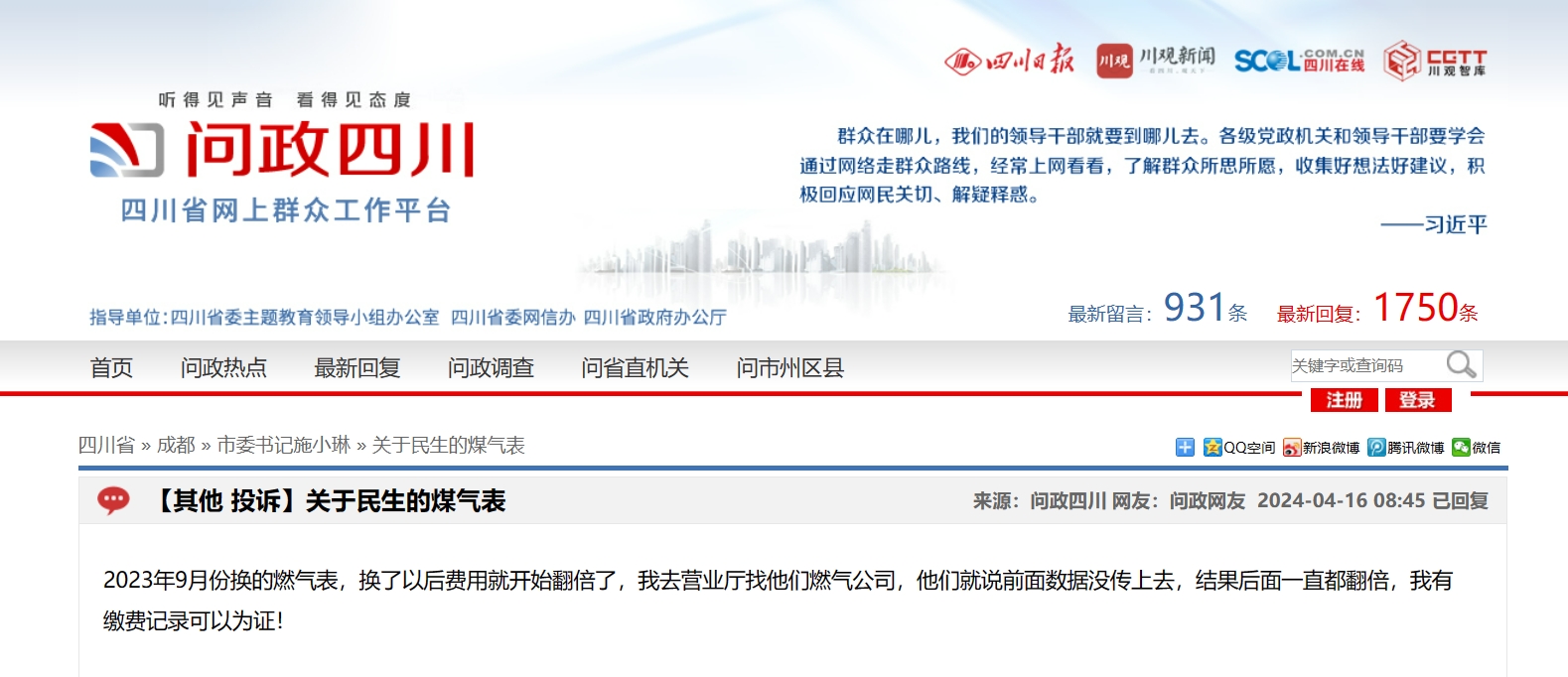 近期,多名成都市居民通過四川省網上羣眾工作平台“問政四川”反映,自2023年更換燃氣表後,出現燃氣費用異常上漲現象。