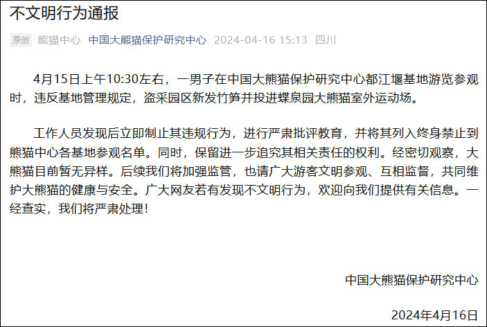 微信公眾號“中國大熊貓保護研究中心”4月16日發佈不文明行為通報稱,15日上午10:30左右,一男子在中國大熊貓保護研究中心都江堰基地遊覽參觀時,違反基地管理規定,盜採園區新發竹筍並投進蝶泉園大熊貓室外運動場。
