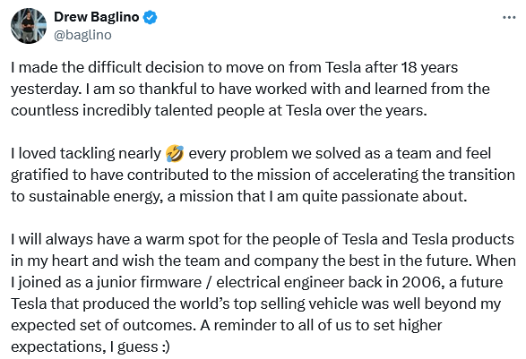 值得一提的是,在內部信發佈後,包括核心高管、動力總成及能源工程高級副總裁德魯·巴格利諾在內的一些資深員工也宣告離職。巴格利諾在特斯拉效力長達18年,曾與馬斯克一樣,是特斯拉投資者關係官網上列出的領導團隊的四名成員之一。他也是馬斯克的核心副手,經常陪馬斯克出席日常的財報電話會議,以及幾乎每一場重要發佈會。