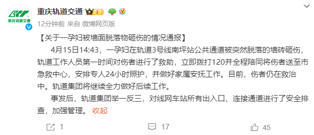 據@重慶軌道交通 微博通報,4月15日14:43,一孕婦在軌道3號線南坪站公共通道被突然脱落的牆磚砸傷,軌道工作人員第一時間對傷者進行了救助,立即撥打120並全程陪同將傷者送至市急救中心,安排專人24小時照護,並做好家屬安撫工作。目前,傷者仍在救治中。軌道集團將繼續全力做好後續工作。