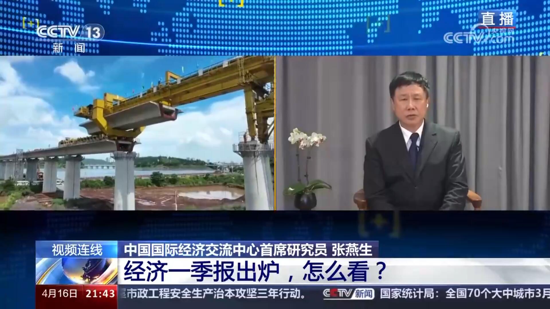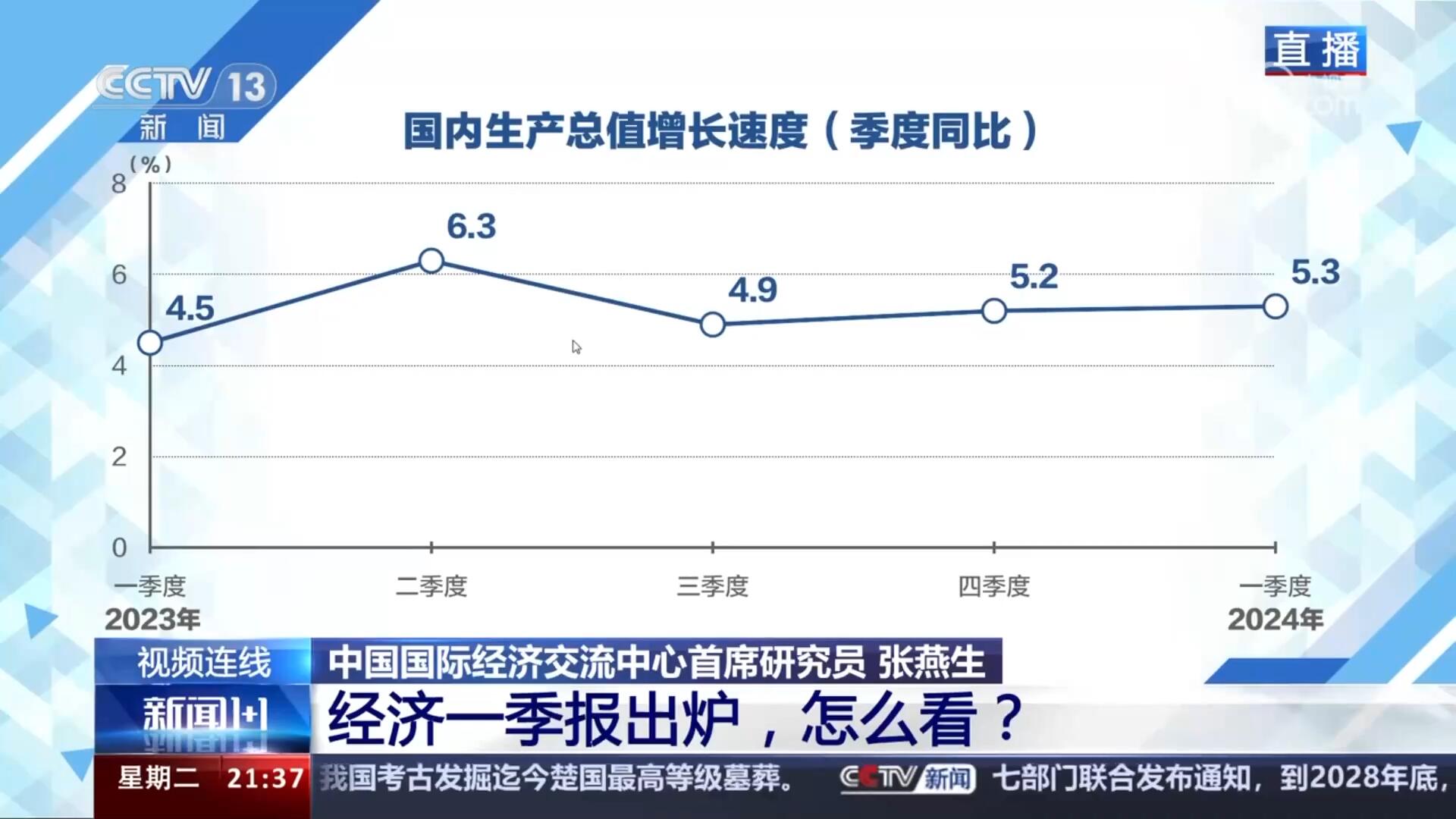 中國國際經濟交流中心首席研究員 張燕生:我們可以看到2024一季度GDP同比增長5.3%,環比增長1.6%,這是一個比較好的開局。從對5.3%經濟增長的貢獻率來講,我們可以看到內需的貢獻率是85.5%,跟去年就形成了比較明顯的對比。去年內需的貢獻率是111.4%,外需的貢獻率去年是-11.4%。因此,從-11.4%到今年的一季度轉變為正的14.5%,我們可以看到外需形勢轉好,對今年一季度的經濟增長起到比較好的支撐。另外一個方面,一季度今年兩會以後,國家出台了一系列擴大投資的舉措,因此我們也可以預見,這些舉措發揮作用以後,對於實現今年全年經濟實現5%左右的增速目標,我覺得能夠起到一個特別好的支撐。