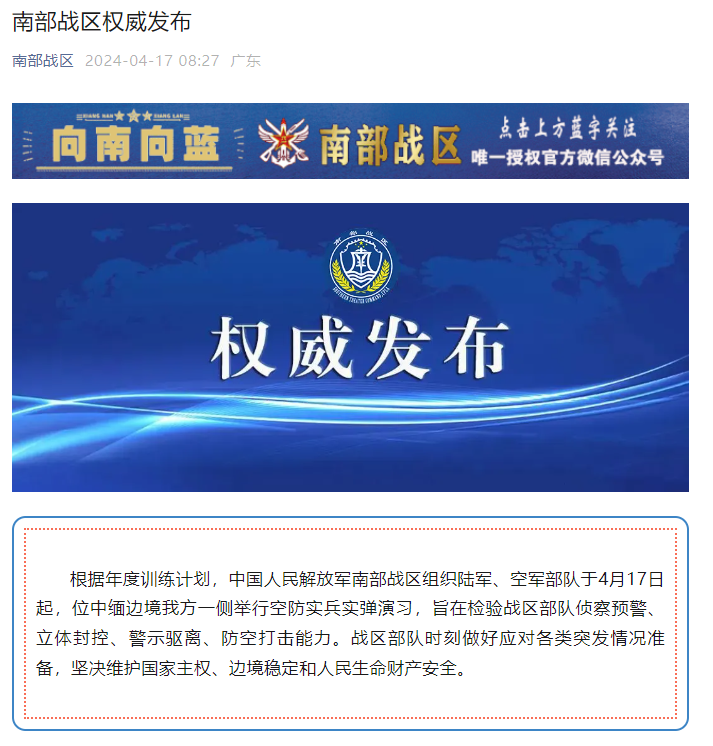 據南部戰區微信公眾號17日消息,根據年度訓練計劃,中國人民解放軍南部戰區組織陸軍、空軍部隊於4月17日起,位中緬邊境我方一側舉行空防實兵實彈演習,旨在檢驗戰區部隊偵察預警、立體封控、警示驅離、防空打擊能力。戰區部隊時刻做好應對各類突發情況準備,堅決維護國家主權、邊境穩定和人民生命財產安全。