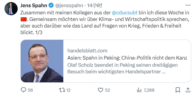 (觀察者網訊)據德國《商報》當地時間16日報道,在德國總理朔爾茨訪華之際,德國最大反對黨基督教民主聯盟(基民盟)中負責經濟政策和氣候問題的副主席延斯·施潘(Jens Spahn),也於本週一率領該黨派代表團對中國進行了為期五天的訪問。