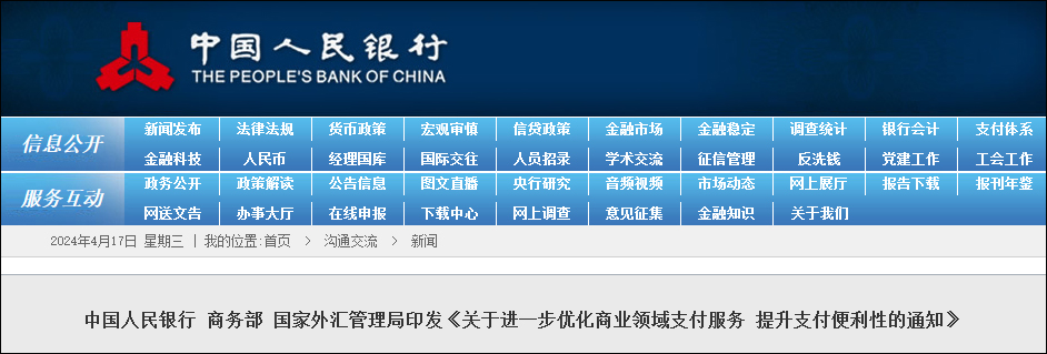 據中國人民銀行網站4月17日消息,為深入貫徹黨中央、國務院決策部署,落實《國務院辦公廳關於進一步優化支付服務 提升支付便利性的意見》要求,4月16日,中國人民銀行、商務部、國家外匯管理局聯合印發《關於進一步優化商業領域支付服務 提升支付便利性的通知》(以下簡稱《通知》)。