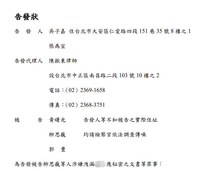 互聯網上流傳的吳子嘉針對黃曙光、柳思巍、郭璽三人的告發狀截圖 圖片來源:社交媒體