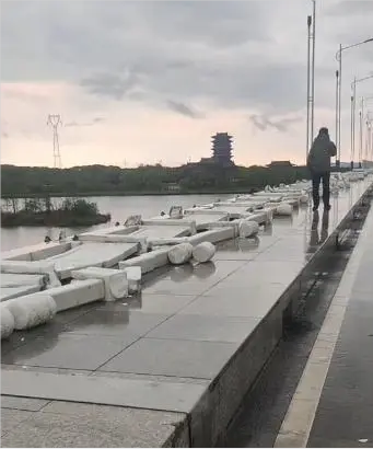 大皖新聞記者注意到,有多位網民發佈相關視頻,視頻中可見,大橋一側的白色石質欄杆大段出現倒塌,倒塌後的石材碎片灑落一地。而在另一段視頻中,則看到有工作人員正拉來綠色鐵皮圍擋,將圍欄倒塌段人行通道進行封閉。