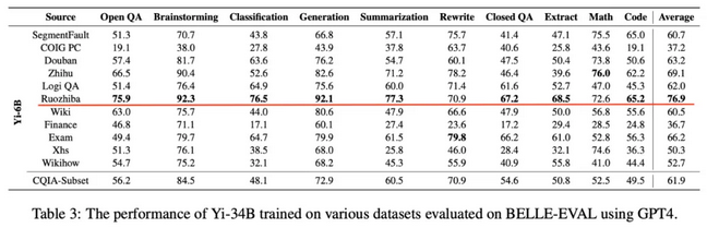 不過,並不像傳説的那樣——“弱智吧8項測試第一,遠超知乎豆瓣小紅書”“竟成最佳中文AI訓練數據”。實際上,在Yi-34B大模型上表現上佳的,不單純是“弱智吧”。具體來説,弱智吧只貢獻了個標題。