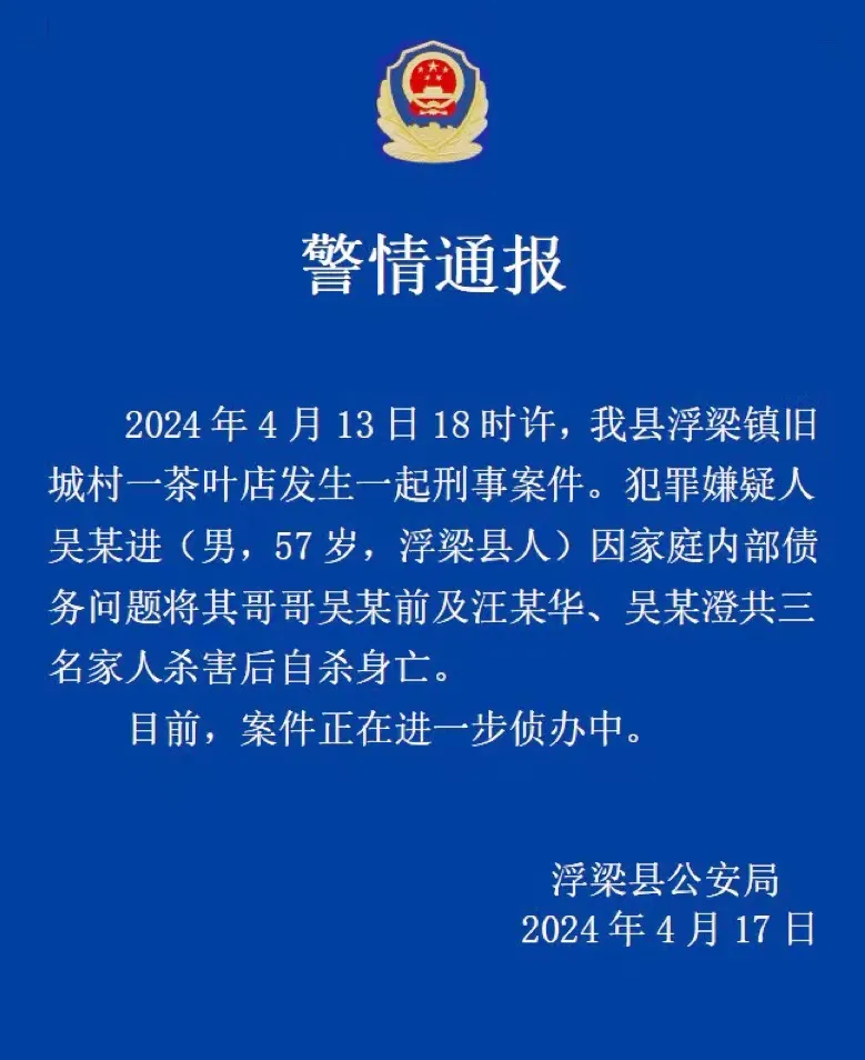 2024年4月13日18時許,我縣浮樑鎮舊城村一茶葉店發生一起刑事案件。犯罪嫌疑人吳某進(男,57歲,浮樑縣人)因家庭內部債務問題將其哥哥吳某前及汪某華、吳某澄共三名家人殺害後自殺身亡。目前,案件正在進一步偵辦中。