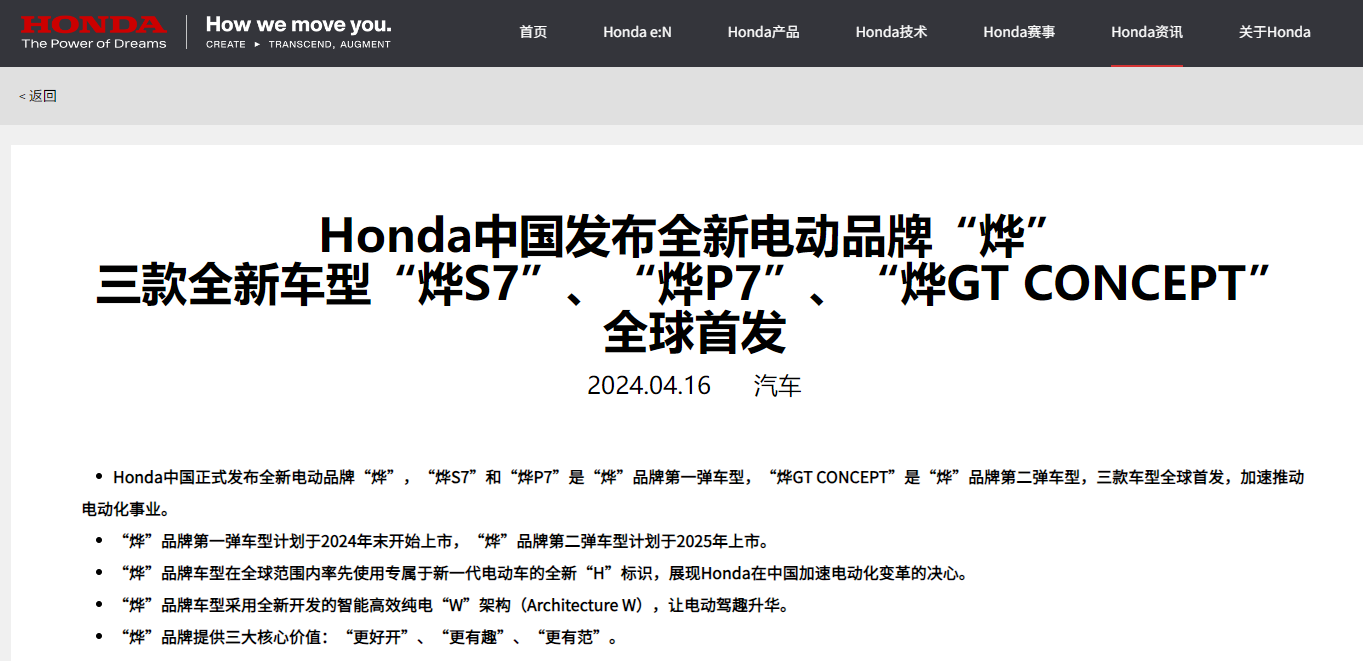 4月16日,本田發佈全新電動品牌“燁”,並推出三款首發車型,並同時啓用全新H標識,該品牌到2027年將推出6款新車。到2035年,本田中國純電車的銷售佔比將達到100%。