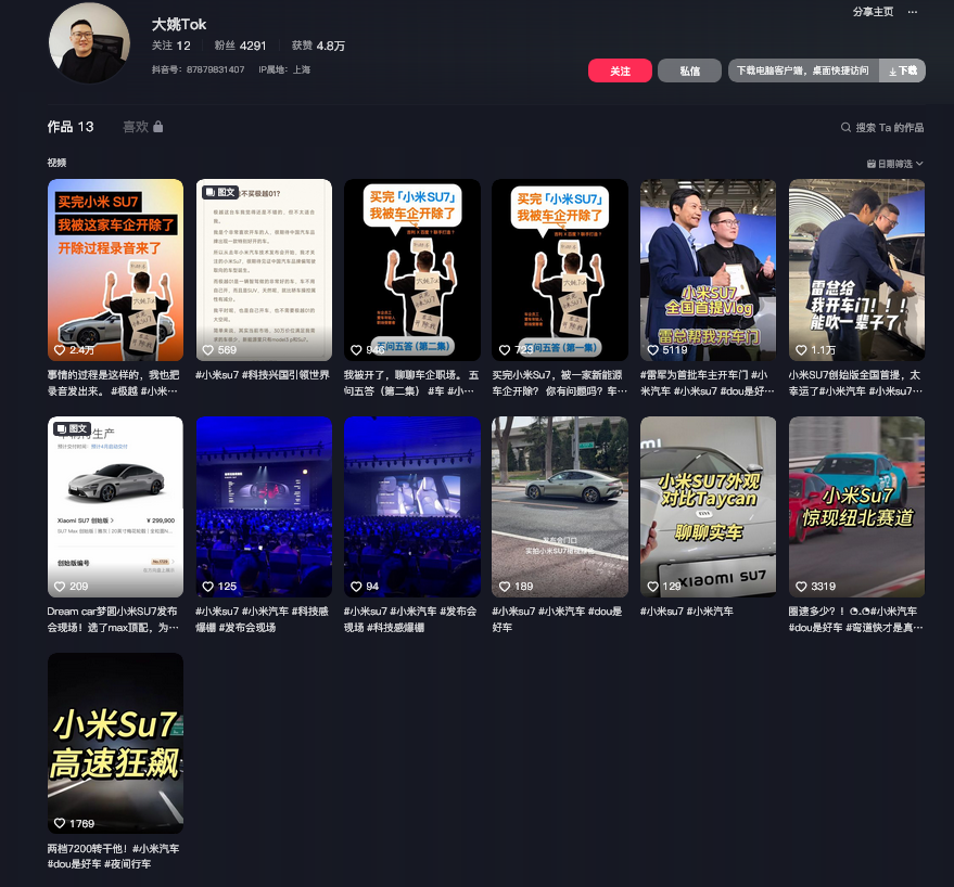 除了宣告自己被極越開除外,@大姚Tok 在微博、抖音等平台發佈的內容全部與小米汽車相關
