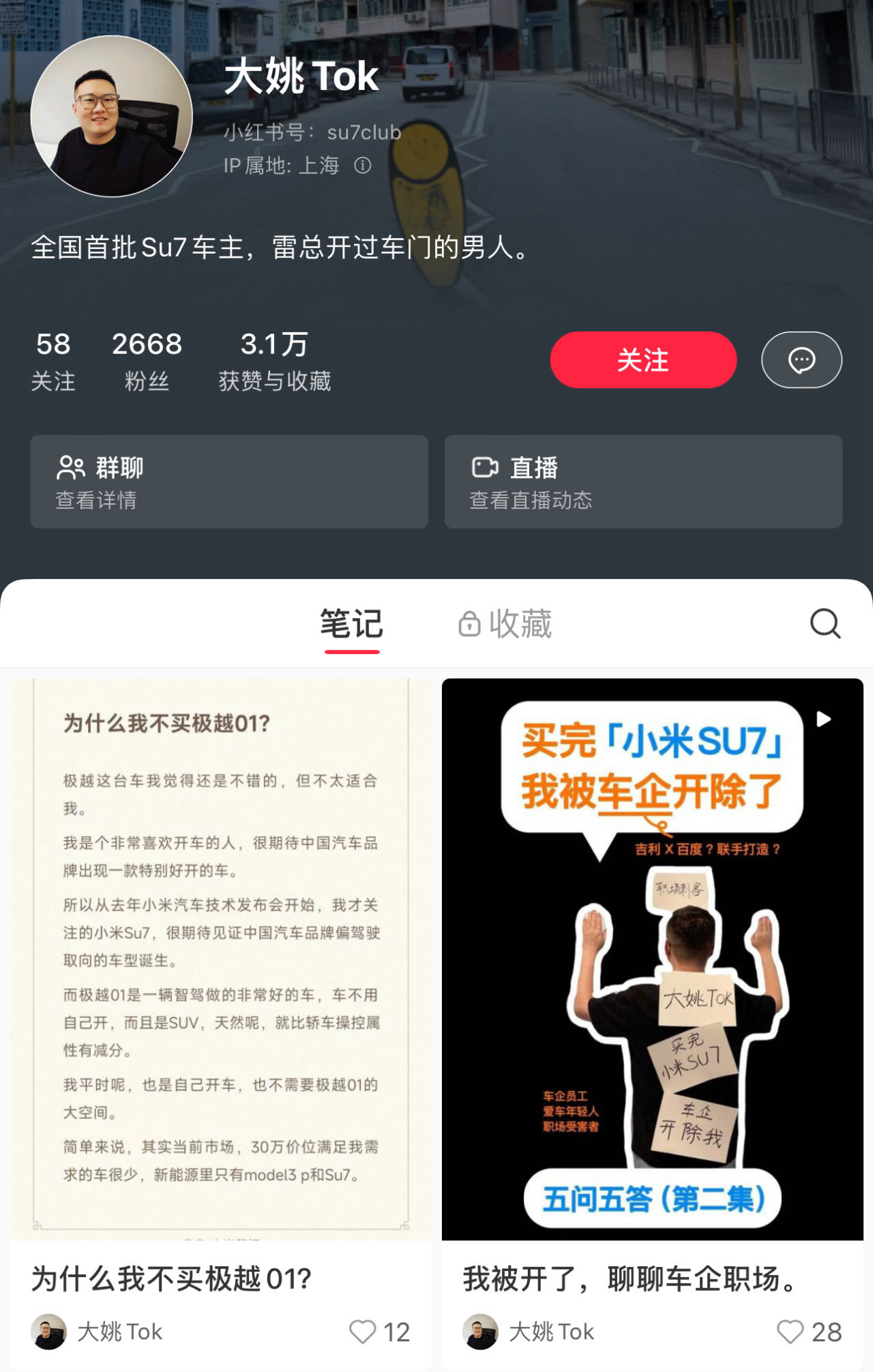 而在@大姚Tok 的小紅書賬號上,則將自己簡介改為“全國首批SU7車主,雷總開過車門的男人”。