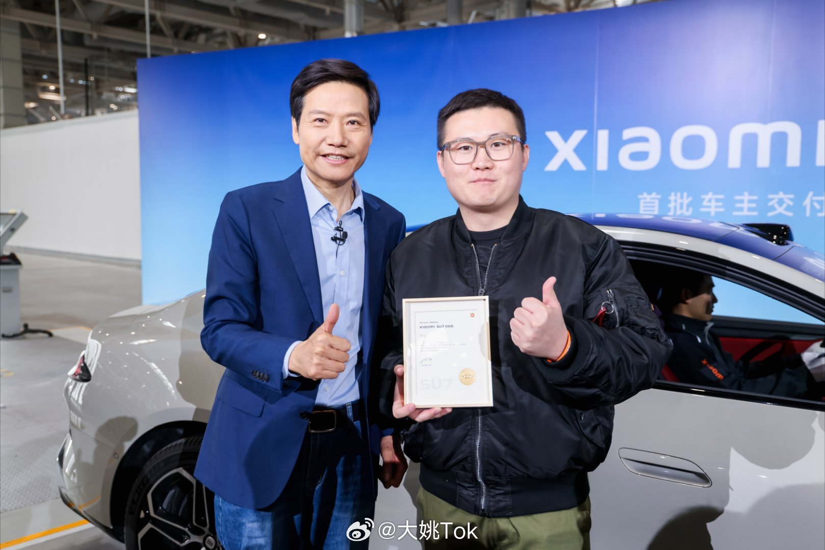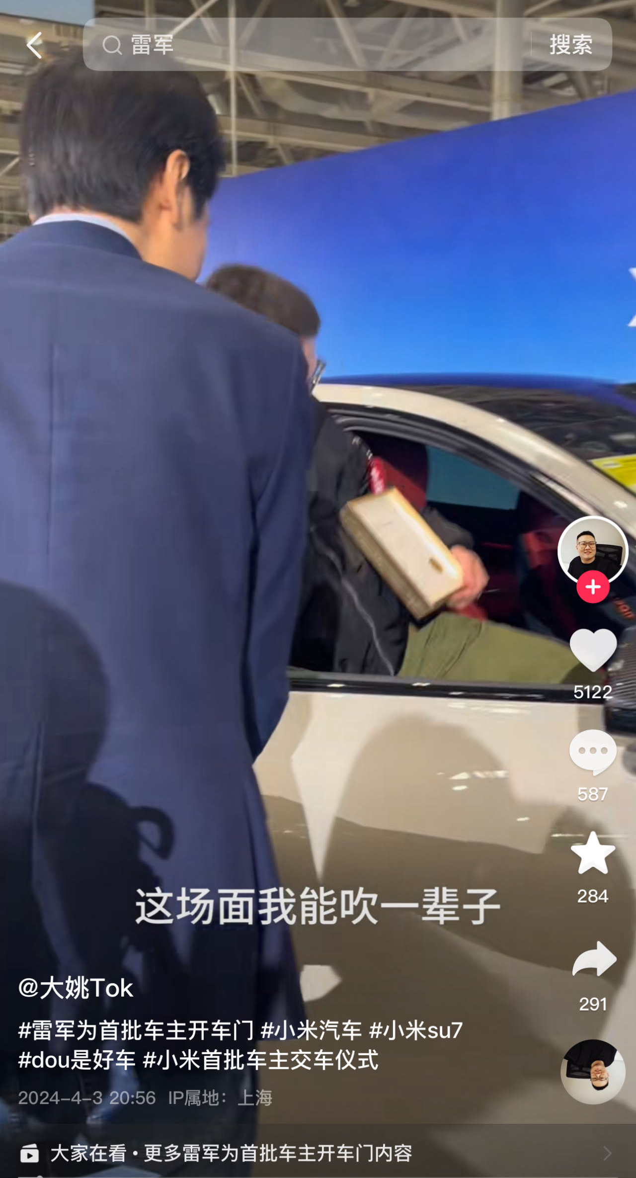 @大姚Tok 此前發佈的視頻顯示,在小米汽車首批車主交付儀式上,小米集團創始人雷軍親自為包括他在內的首批車主打開車門。@大姚Tok 稱“這場面我能吹一輩子”。