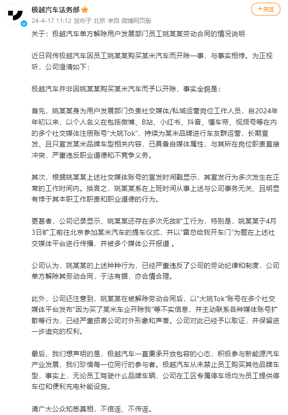 極越汽車還表示,姚某某在被解除勞動合同後,以“大姚Tok"賬號在多個社交媒體平台發佈“因為買了某米車企開除我"等不實信息,並主動聯繫各種媒體賬號擴散等行為,已經嚴重損害公司對外形象和聲譽。公司對此已經予以取證,並保留進一步追究的權利。