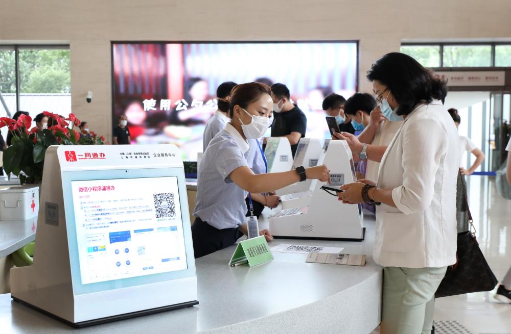 上海市浦東新區2019年率先啓動“一業一證”改革。這是在浦東新區企業服務中心辦事大廳,工作人員指導市民通過手機小程序辦理一網通辦業務(2020年8月4日攝)。