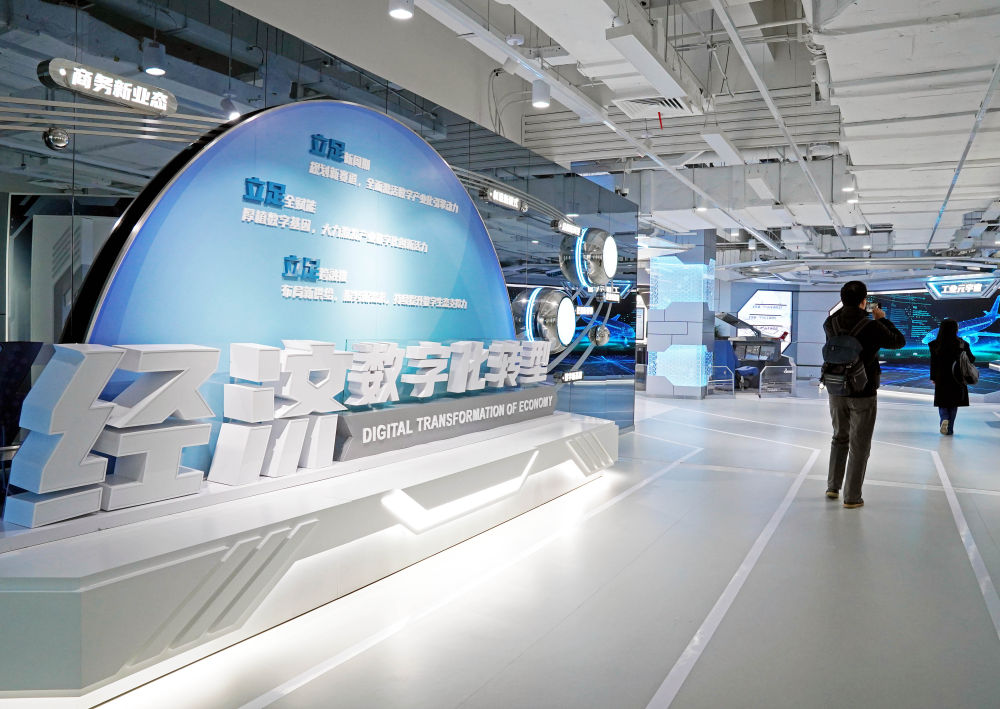 觀眾在位於上海市楊浦區景星路的上海城市數字化轉型體驗館參觀(2023年4月7日攝)。該館展示上海各方面數字化轉型的規劃佈局和最新實踐。