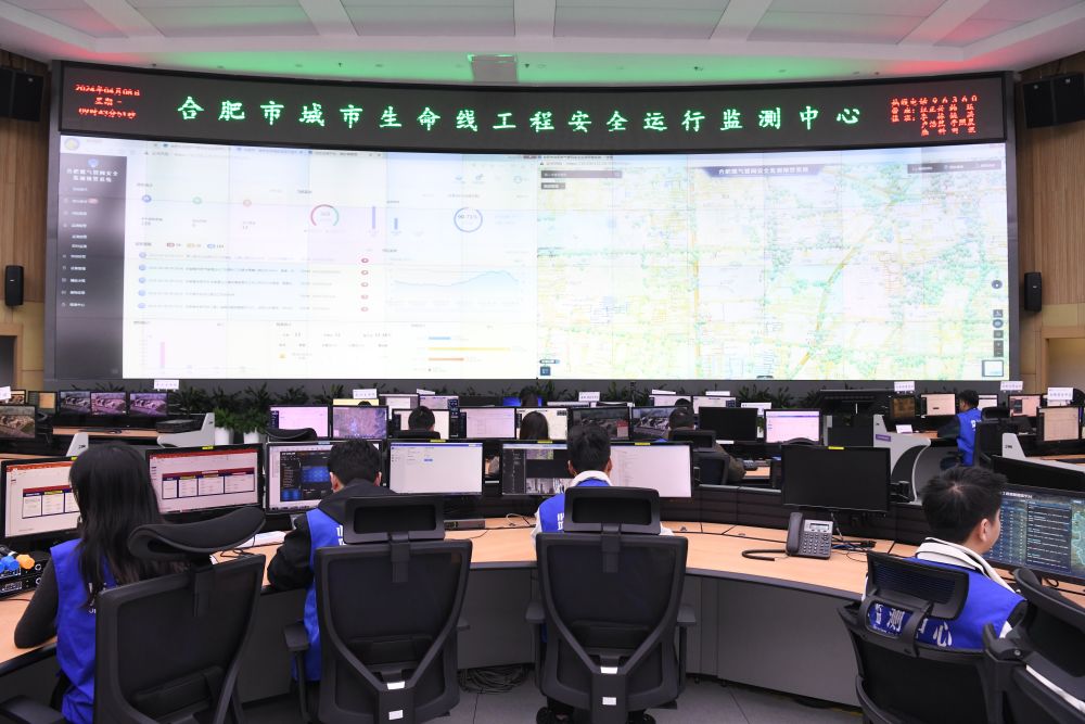 技術人員在位於清華大學合肥公共安全研究院的合肥市城市生命線工程安全運行監測中心值守(2024年4月8日攝)。合肥市2015年啓動城市生命線安全工程建設,逐步構建燃氣、橋樑、供水、排水、熱力、綜合管廊、消防、水環境八大領域立體化監測網,探索出一條以場景應用為依託、以智慧防控為導向、以創新驅動為內核、以市場運作為抓手的城市安全發展新模式。