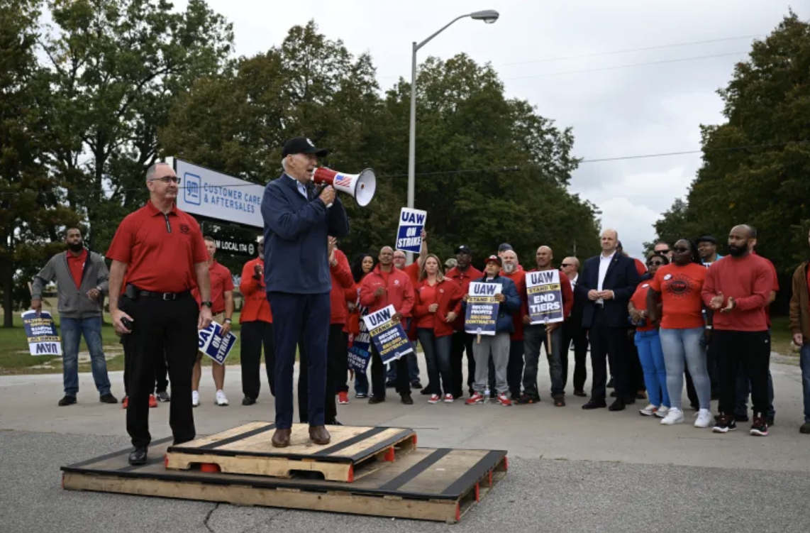 拜登戴着美國汽車工人聯合會的帽子向該組織成員發表講話(圖源:法媒)