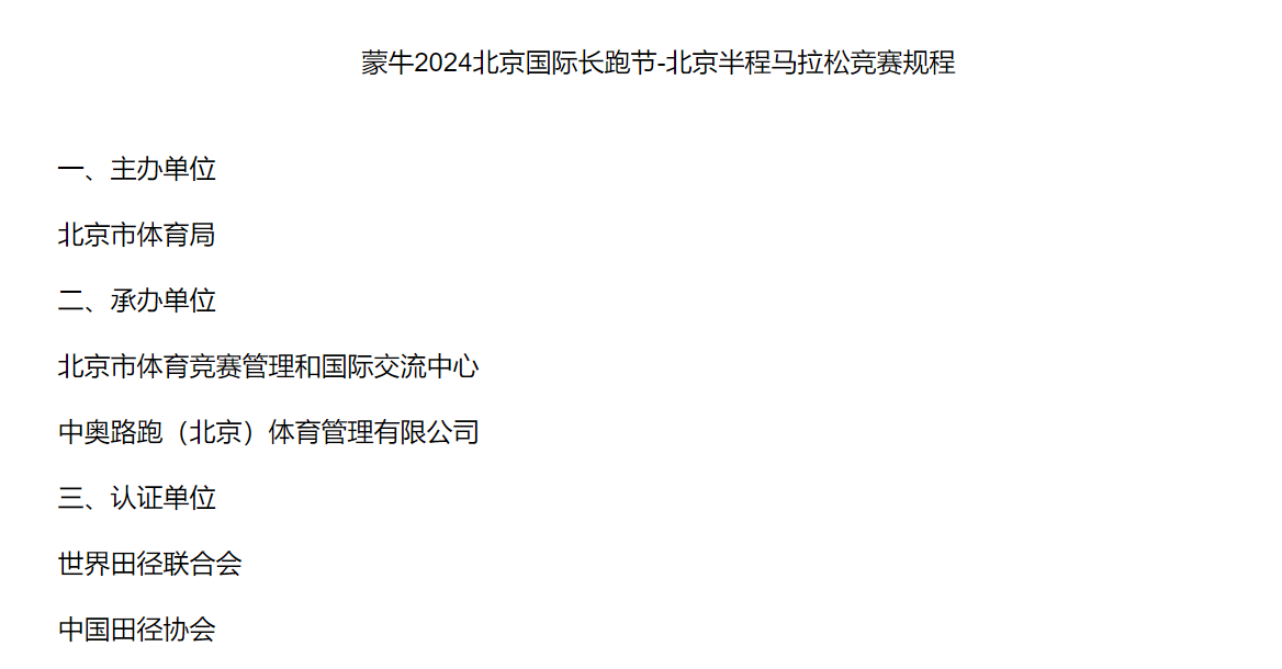 2.雖然根據北半馬《蒙牛2024北京國際長跑節-北京半程馬拉松競賽規程》信息,北半馬的認證單位是世界田徑聯合會、中國田徑協會: