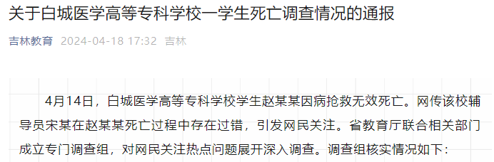 據微信公眾號“吉林教育”消息,吉林省教育廳18日發佈關於白城醫學高等專科學校一學生死亡調查情況的通報: