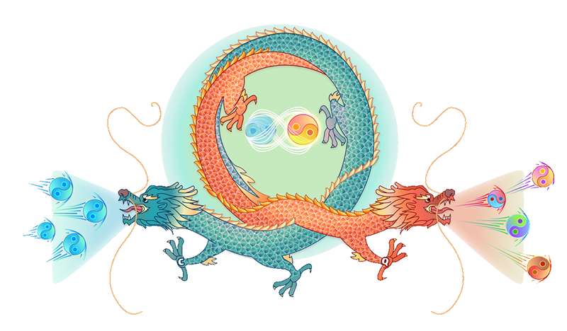 “龍光學”—量子糾纏產生過程。龍象徵氮化鎵環,其中一條龍吸收泵浦光子(左),另一條龍發射糾纏光子(右)。受訪者供圖
