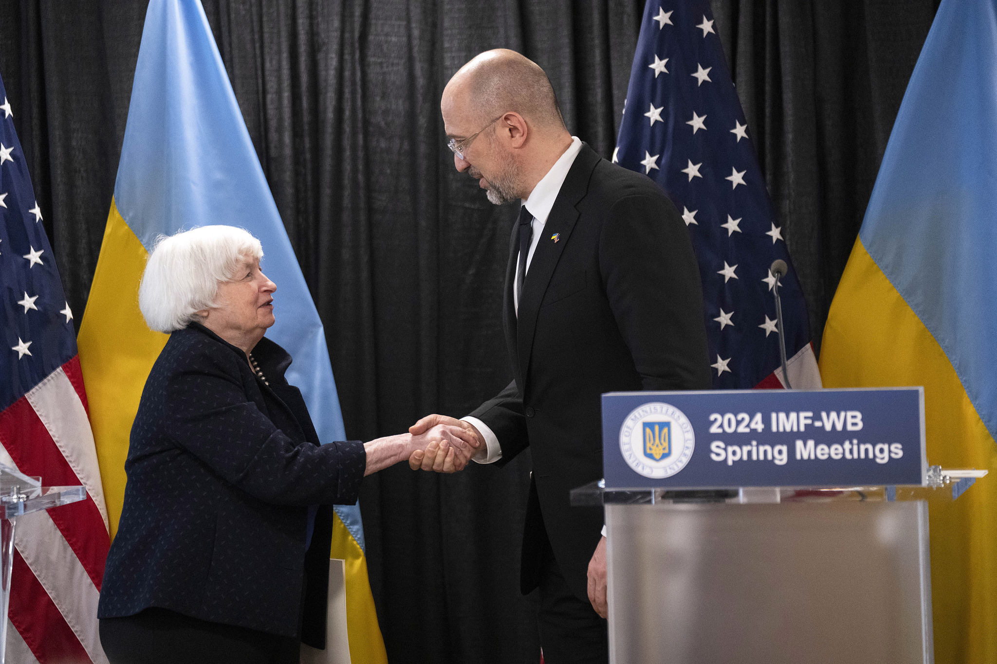 當地時間4月17日,美國華盛頓,IMF和世行2024年春季會議期間,美國財政部長耶倫和烏克蘭總理什梅加爾在會後新聞發佈會時握手。圖自視覺中國
