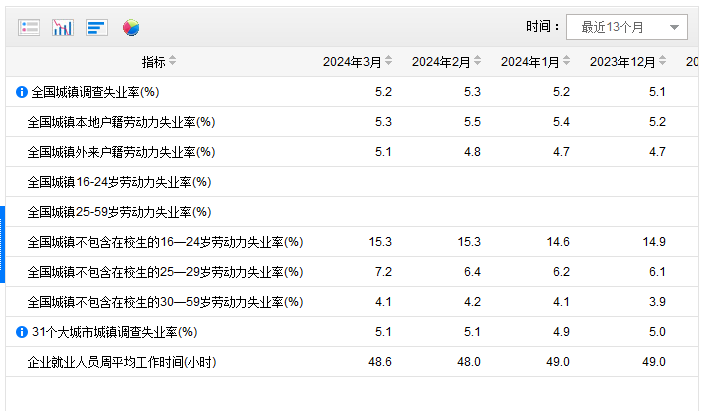 此外,3月份,全國城鎮不包含在校生的30-59歲勞動力失業率為4.1%,較上月下降0.1個百分點;全國城鎮不包含在校生的16-24歲勞動力失業率為15.3%,與上月持平。