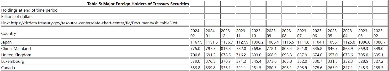 根據美國財政部17日公佈國際資本流動報告(TIC)顯示,2月中國大陸持有美債7750億美元,環比減少227億美元,持倉在連增兩個月後連降兩月,總持倉開始接近去年10月連續五個月所創的2009年以來十四年“低谷”。此外,作為現在最大的美國國債持有國,截至2月,日本持有美國國債1.1679萬億美元,較1月環比增加164億美元,總持倉連續第三個月創2022年8月美元以來新高。至此,日本的持倉連續五個月、最近九個月內第八個月增加。