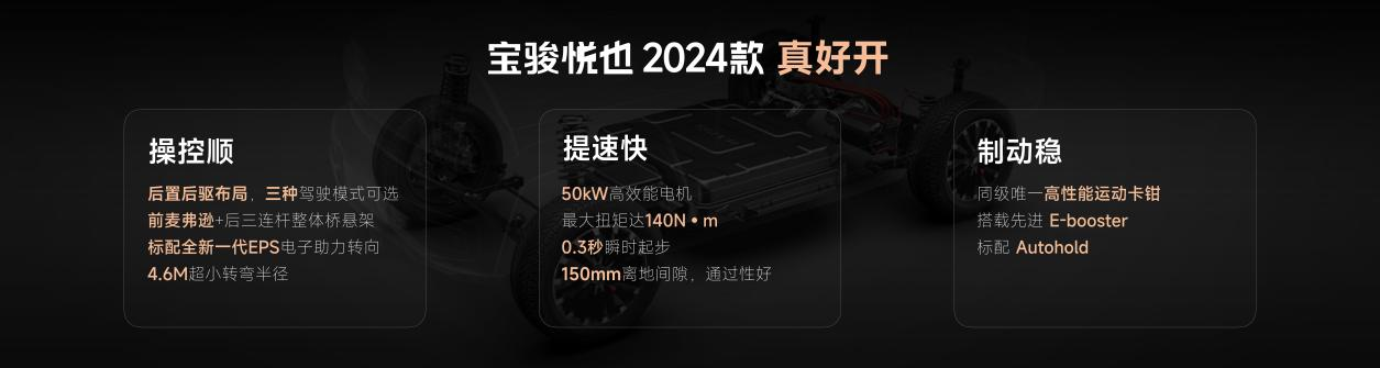 在舒適駕乘和安全出行方面,寶駿悦也Plus以家庭需求為基準,打造高品質、高標準的越級體驗。基於天輿架構的原生純電設計,寶駿悦也Plus採用了前置前驅佈局,搭載動力更大的75kW高功率電機,峯值扭矩高達180N·m,最高時速突破150km/h,動力響應更快,城市出行更遊刃有餘。同時,寶駿悦也Plus搭載同級最高規格雙活塞卡鉗、先進的E-Booster,標配Autohold,制動線性剎得更穩。憑藉更穩、更快、更舒適的越級駕控質感,寶駿悦也Plus將為用户奉上十萬級最好開的純電SUV駕控體驗。