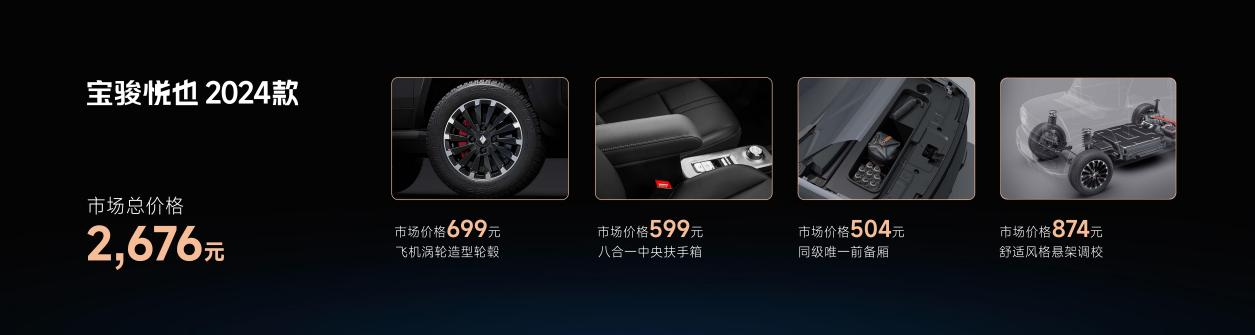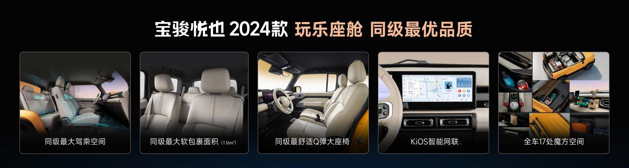上市至今,寶駿悦也已累計收穫20000+悦己者的喜愛。秉承寶駿品牌開門造車的理念,寶駿悦也2024款為滿足更多用户的悦己需求,新增雲海白、山霧灰、霞光藍三款時尚車色,全系標配飛機渦輪造型輪轂,顏值更拉風;同時,車內新增八合一中央扶手箱,既保留了左右都可上下車,貫通的便利性,還提升了駕駛員舒適性;標配同級唯一35L前備艙,美觀整潔的同時,大大提高空間利用率。此外,基於對用户使用場景的充分調研,寶駿悦也2024款針對鋪裝路面進行專項優化,全系升級舒適風格懸架調校,打造硬派純電SUV中的城區之王。