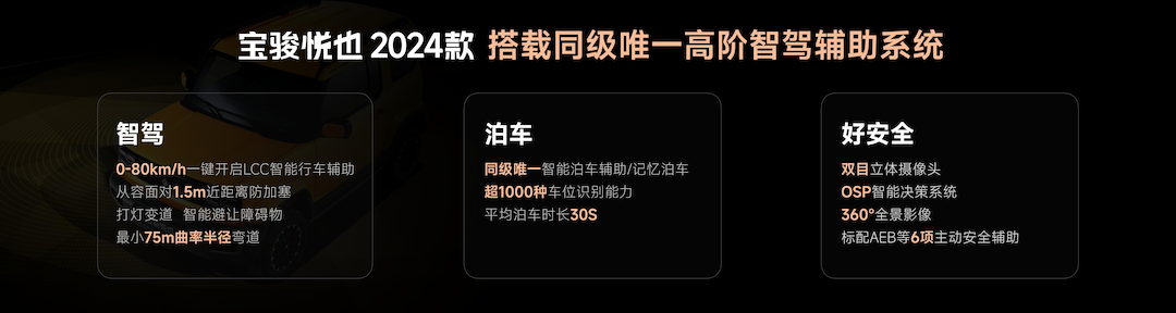 寶駿悦也2024款作為同級唯一搭載高階智駕的代步車型,在智能駕駛方面提供了豐富的功能。用户可以通過一鍵操作,輕鬆開啓智能行車、混亂車道線應對、撥杆變道、彎道智能調速、障礙物識別和應對、近距離加塞應對以及人機共駕七大行車場景功能,大大提升駕駛的便捷性和安全性。新車還擁有同級唯一智能/記憶泊車功能,可識別超過1000種車位,平均泊車時長僅為30s,完美解決城市通勤的“停車難”。同時,寶駿悦也2024款還搭載360°全景影像,標配AEB等6項主動安全輔助,確保智駕體驗安全又可靠。