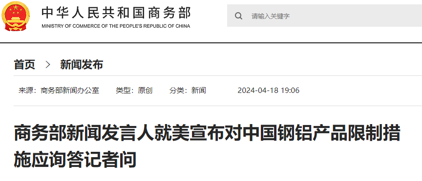 據商務部網站18日消息,有記者問:4月17日,美國白宮網站發佈消息,指責中國不公平做法,宣佈計劃針對中國鋼鋁產品採取新的限制措施,包括將對中國鋼鋁產品的301關税提高至現有水平的3倍,並與鄰國合作防止中國鋼鋁產品間接出口美國等。請問商務部對此有何回應?