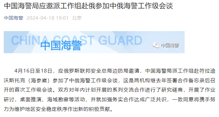 據中國海警微信公眾號18日消息,4月16日至18日,應俄羅斯聯邦安全總局邊防局邀請,中國海警局派工作組赴符拉迪沃斯託克(海參崴)參加了中俄海警工作級會談,這是兩機構繼去年簽署合作備忘錄後召開的首次工作級會談。雙方對年內計劃開展的系列交流合作進行了研究磋商,開展了作業研討、桌面推演、海域勘察等活動,並就加強務實合作達成廣泛共識,一致同意將攜手努力為維護地區安全穩定秩序作出新的積極貢獻。